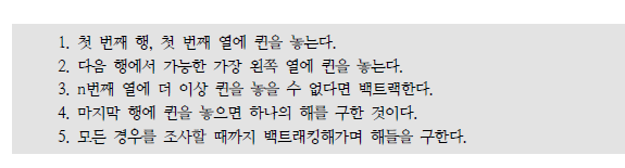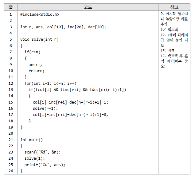 깊이우선탐색을 기반으로 퀸을 더 이상 못 놓는 상태라면 이전 상태로 백트랙하여 가능한 상태가 될 때까지 반복하는 것을 구현한 것이다.