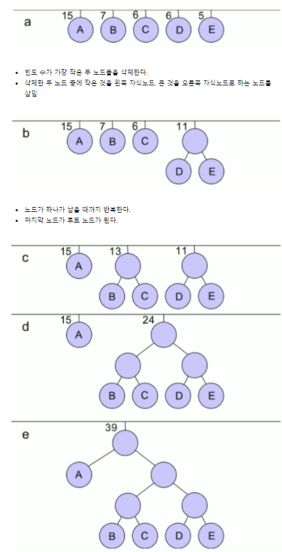 주어진 문자열을 트리를 이용해 2진수로 압축하는 알고리즘 중 하나이다. 최소 힙을 이용한다.