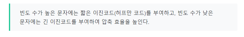 이 접두어 코드를 아스키코드로 한다면? 총 24bit의 저장 공간을 소비한다. 반면에 압축한 상태 그대로 이진코드로 표현한다면 0110111로 7bit로 압축이 가능하게된다. 이처럼 입력 문자의 빈도수를 가지고 압축하는 것이 허프만 코딩이다.