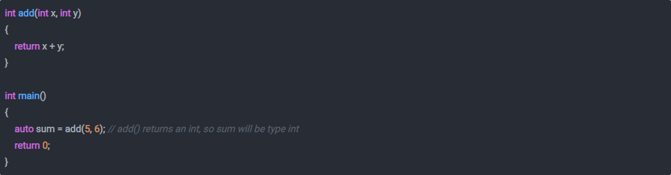 x + y는 정수로 평가되기 때문에 컴파일러는 add() 함수가 int 타입의 반환 값을 가져야 한다고 추론한다.