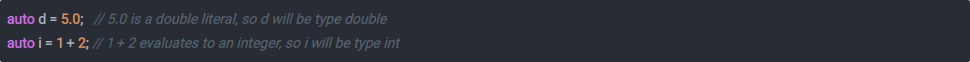5.0이 부동 소수점 숫자 리터럴이라는 것을 이미 알고 있다면, 왜 d의 타입(=자료형)을 double이라고 명시적으로 선언해야 할까? 변수를 초기화할 때 사용하는 값을 기준으로 적절한 타입을 추론하도록 하면 편하지 않을까?
