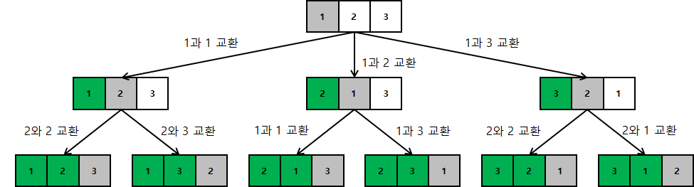 위의 재귀를 이용한 알고리즘은 그림에서 알 수 있듯이, 6가지 경우의 수를 도출하기 위해 9 * 2번의 스왑(swap)을 수행하고 있습니다.