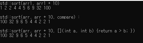 세 번째 예제를 보면 sort(arr3.begin(), arr3.end(), [](int a, int b){return a > b;}); 이런 식으로 sort 함수의 세 번째 인자에 일반 함수 대신, 람다 함수를 집어넣은 것을 볼 수 있습니다.